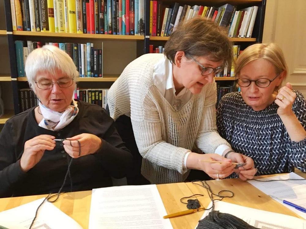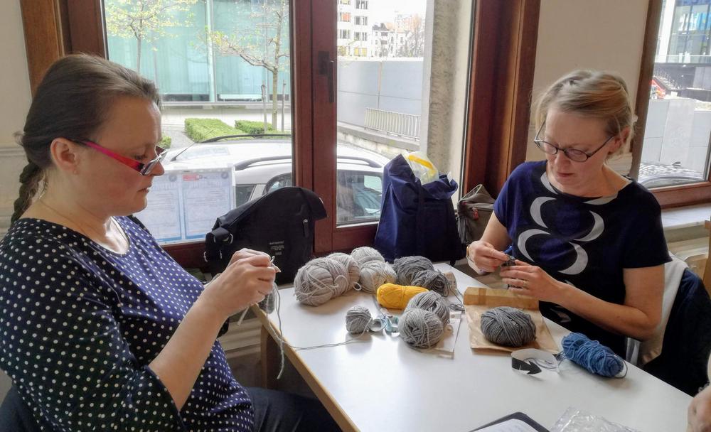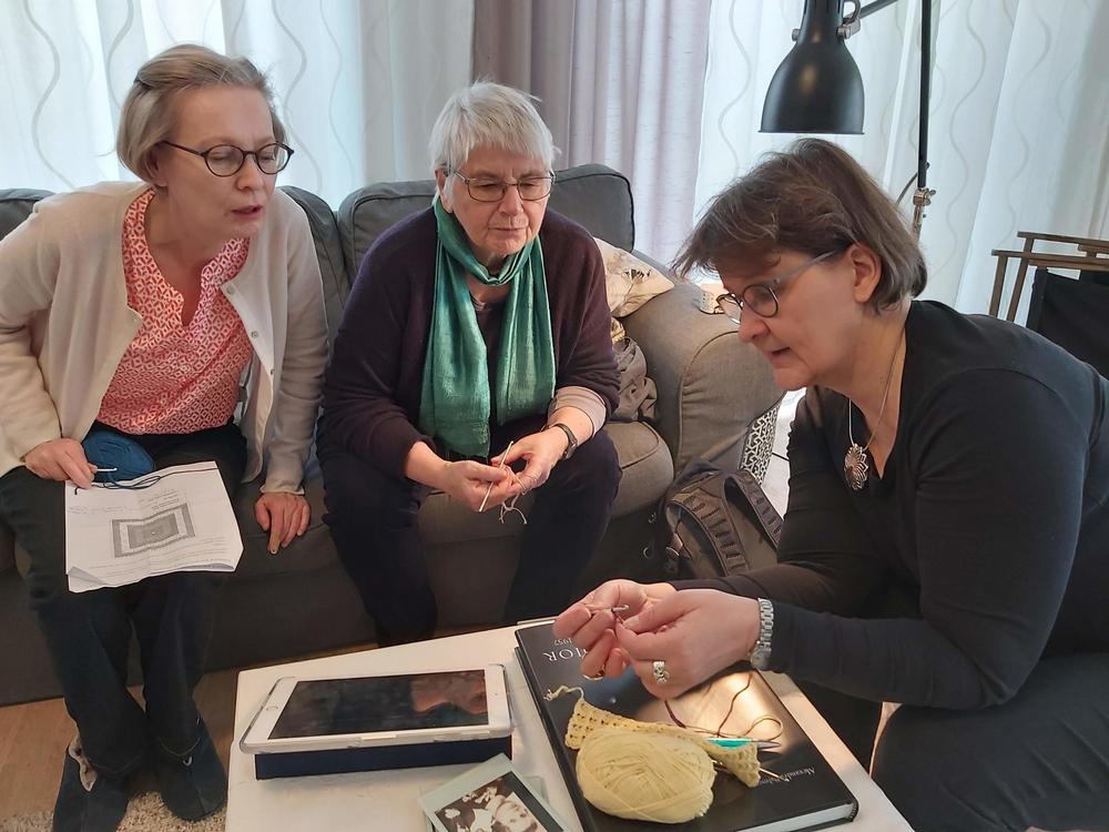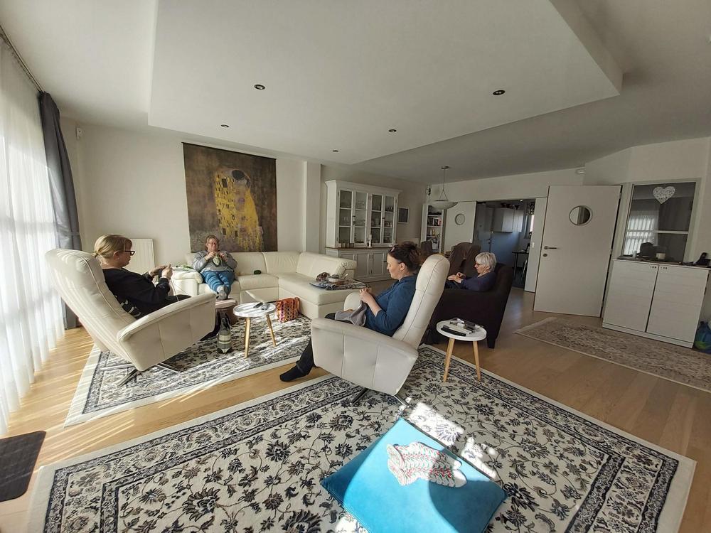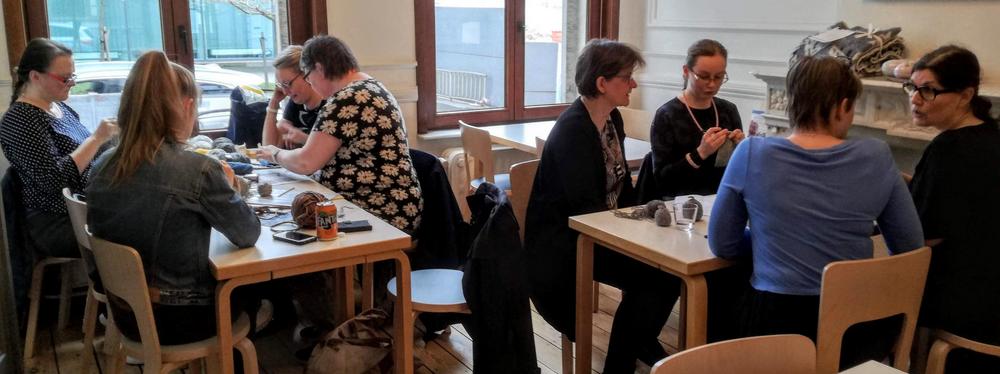 Emme ihan osanneet ajatella, että tämä olisi viimeinen kerta pariin vuoteen, kun kokoonnumme tekemään käsitöitä samassa tilassa. Teimme omia töitämme ja osa opetteli sukan neulomista.