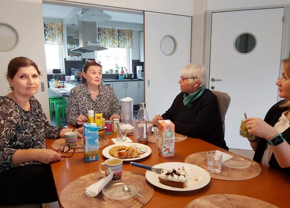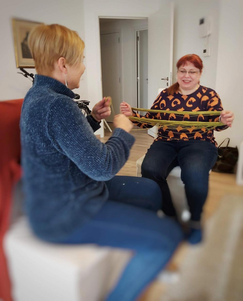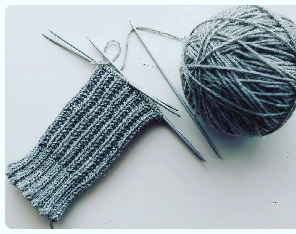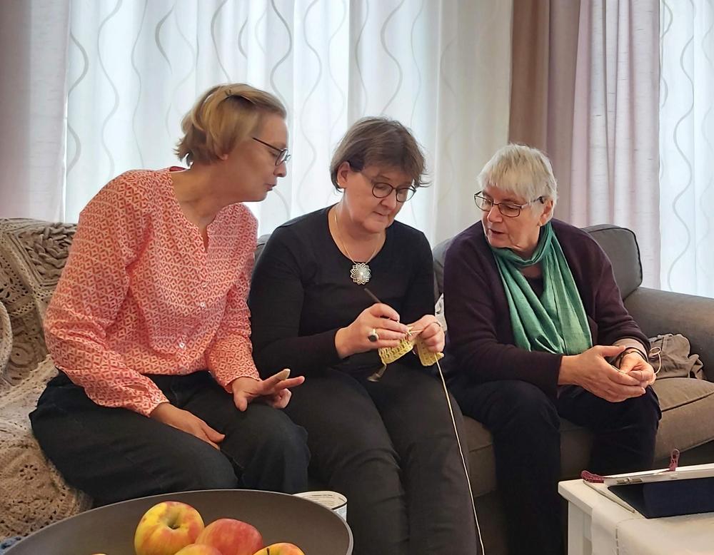 Emme ihan osanneet ajatella, että tämä olisi viimeinen kerta pariin vuoteen, kun kokoonnumme tekemään käsitöitä samassa tilassa. Teimme omia töitämme ja osa opetteli sukan neulomista.