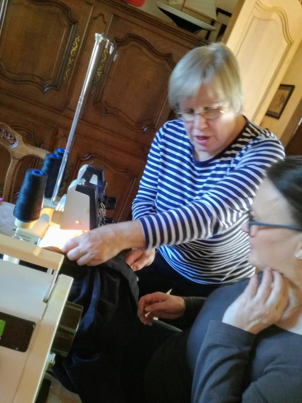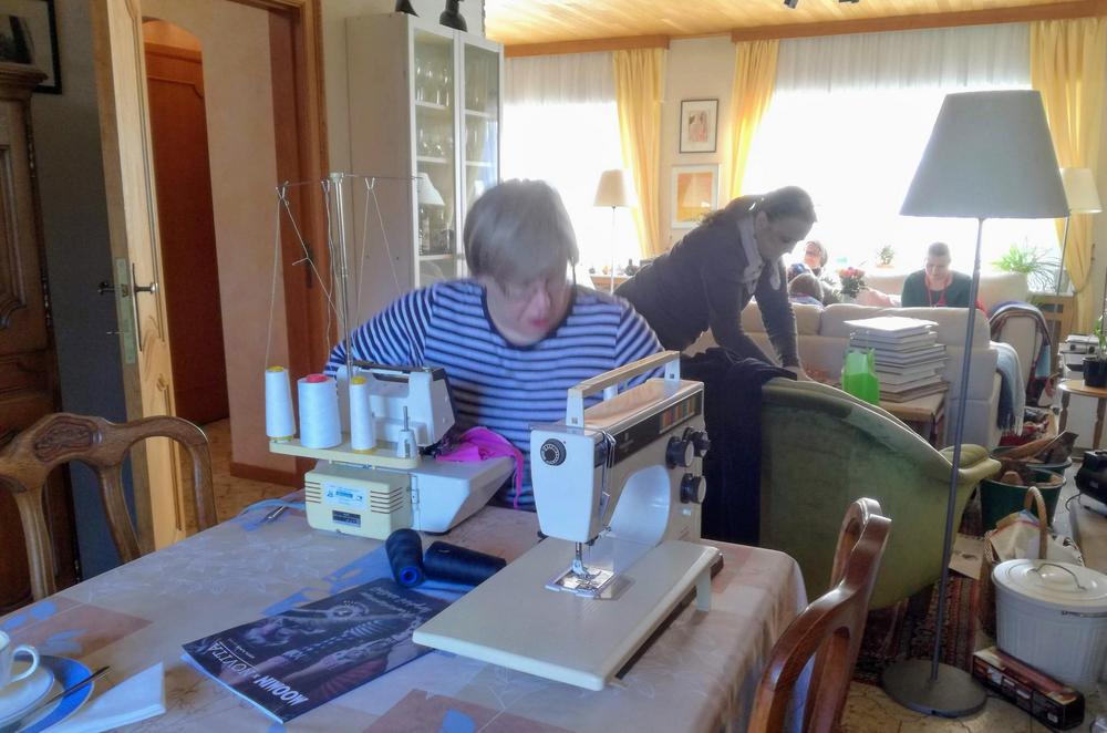 Kokoonnuimme Latvalan Ritvalla Sterrebeekissä. Ritvalla on kotonaan sekä ompelukone että saumuri, joten niitä pääsivät käyttämään kaikki halukkaat