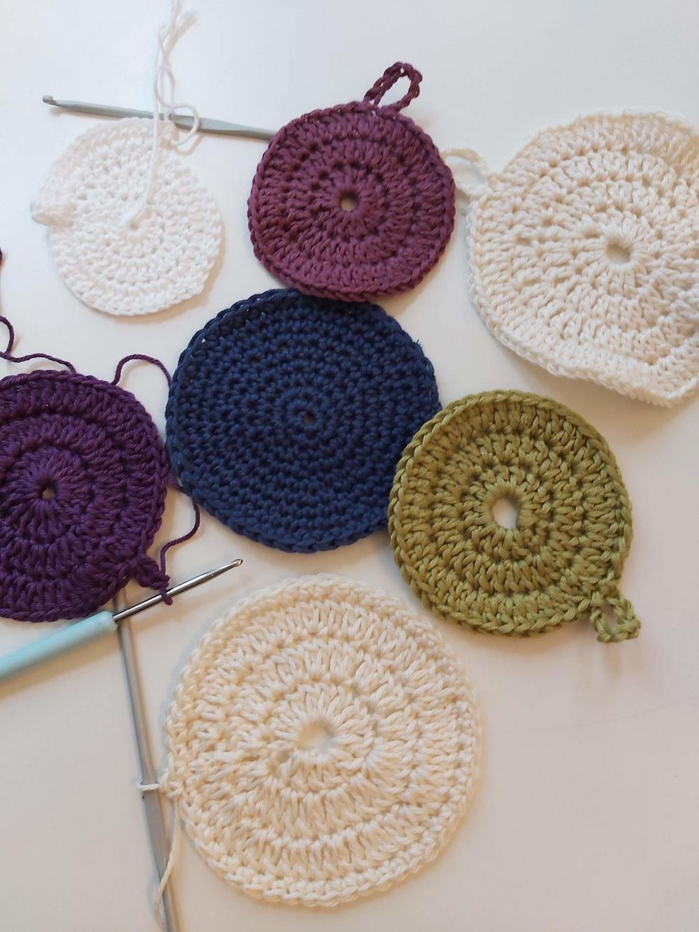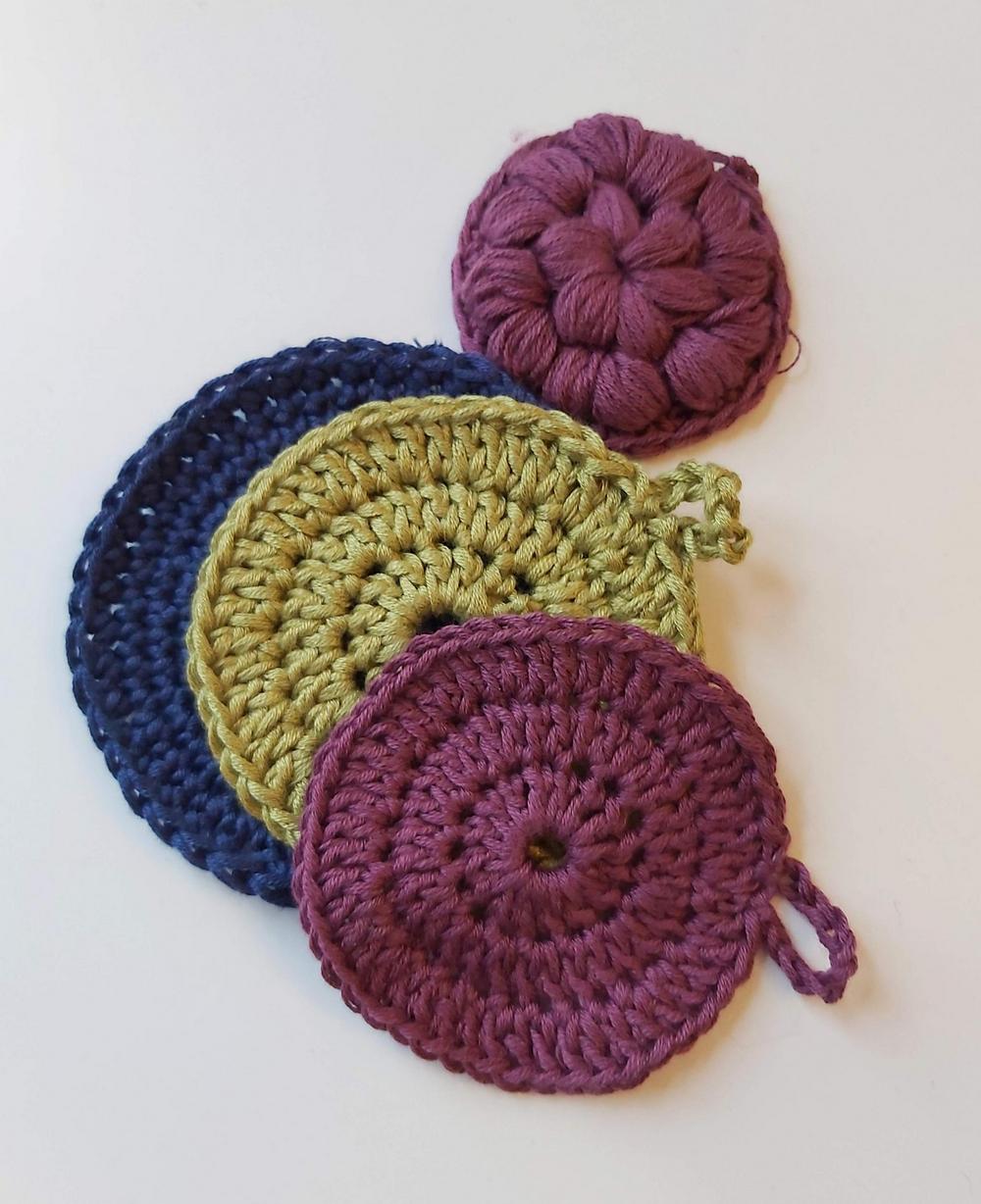 Viidennellä opetuskerralla harjoittelimme Päivin ja Tuijan opastuksella ihonpuhdistuslappujen virkkausta. Kestävää kehitystä edistämme tälläkin tavalla!