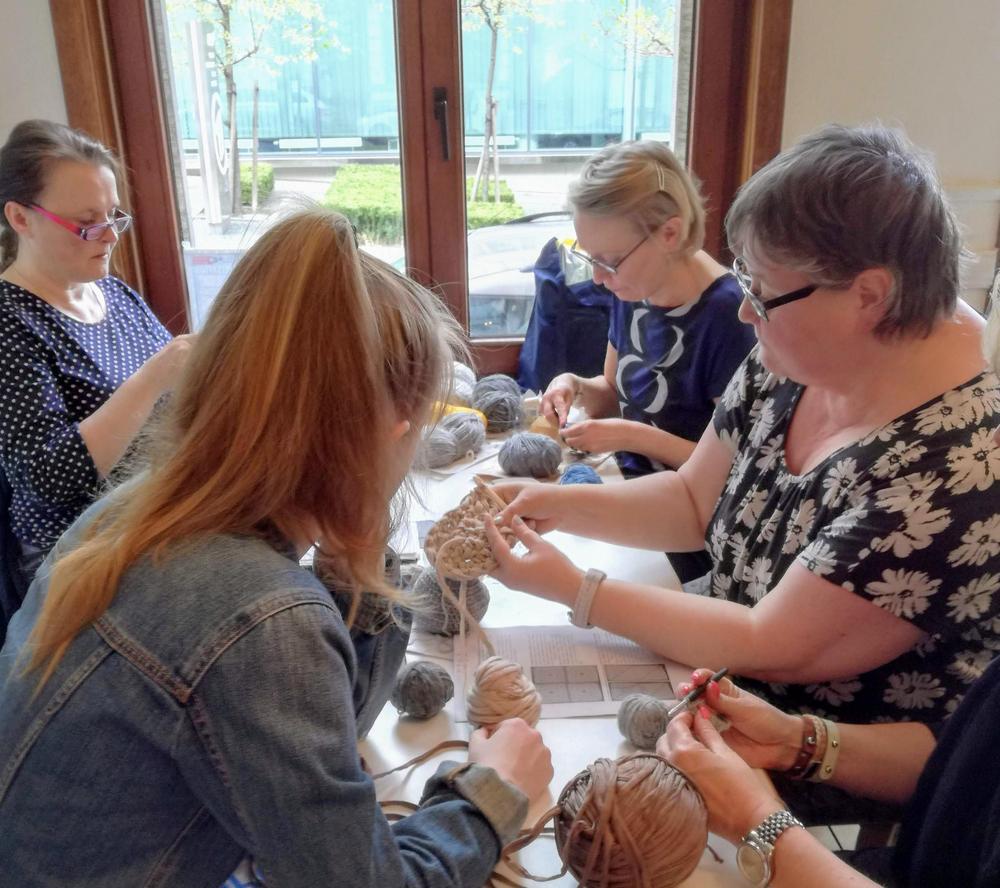 Jäsenistön pyynnöstä aloitimme harjoittelemaan virkkausta ihan alkeista. Ensimmäisellä kerralla opettelimme virkkaamaan valeampiaisenpesän. Virkkauksen saloihin meitä ohjasivat Tuija Heino-McRobert, Päivi Koskinen ja Sanna Sutter. Virkkausta oli selvästi odotettu, niin paljon marttoja kokoontui Brysselin merimieskirkon kahvilaan