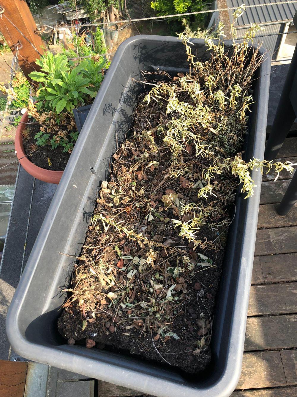 Tässäpä Katriinan, omien sanojensa mukaan ”lähes villiintynyt viljelylaatikko”. Kata kertoo: ”Kasvatan yrttejä, ja tässä laatikossa ne tuntuvat viihtyvän. Ostin laatikon joitakin vuosia sitten Avevesta, ja käytän sitä vuoden ympäri. Keväisin vaihdan mullan: joka toinen vuosi kaiken mullan ja joka toinen vuosi vain puolet mullasta. Käytän näitä yrttejä ruoanlaitossa, mutta koristelen myös puutarhapöytää ja kukka-asetuksia yrteillä ja yrttikimpuilla.”