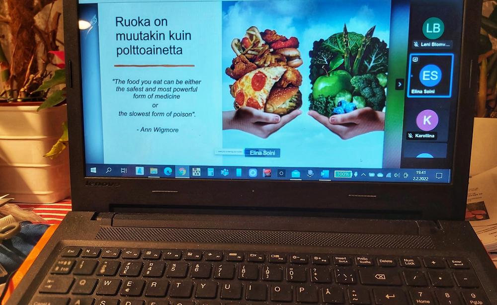 Jitsiin oli saapunut kaksikymmentä marttaa kuuntelemaan ravitsemusterapeutti Elina Soinin alustusta aiheesta ”Askeleet terveelliseen keski-ikään – voimaa ja parempaa oloa ravinnosta”. Alustuksen kävimme vilkasta keskustelua aiheesta.