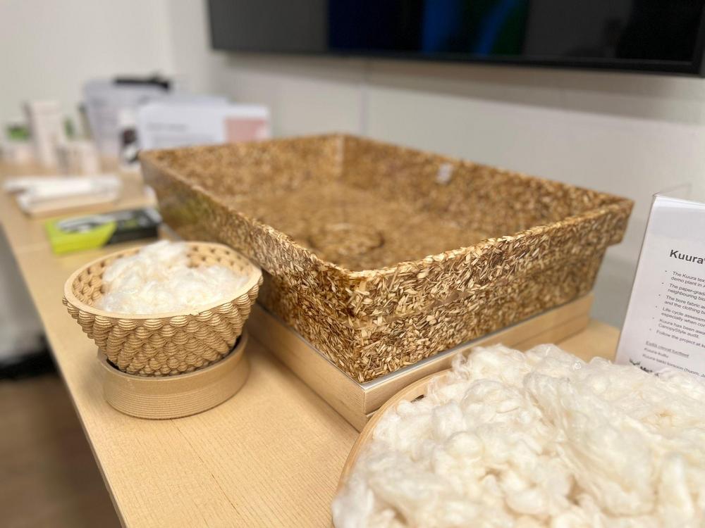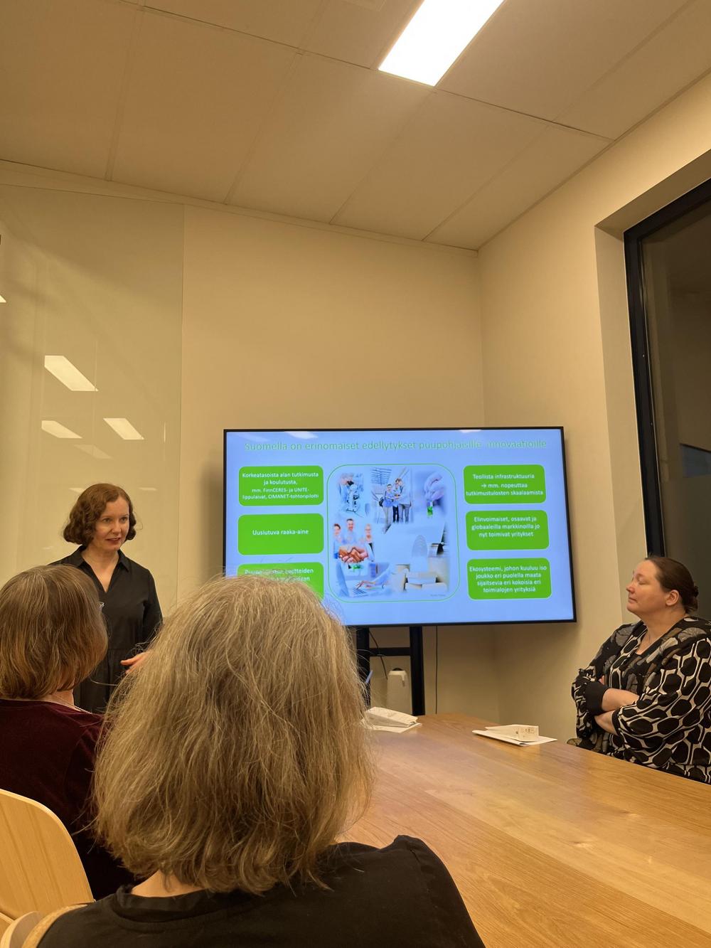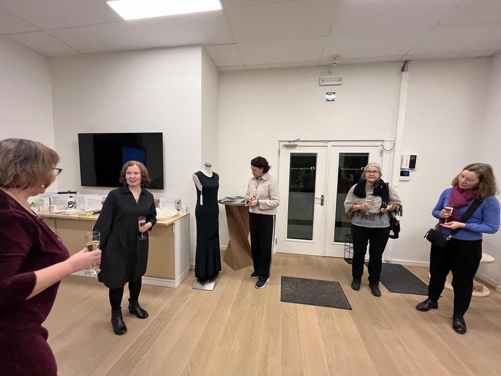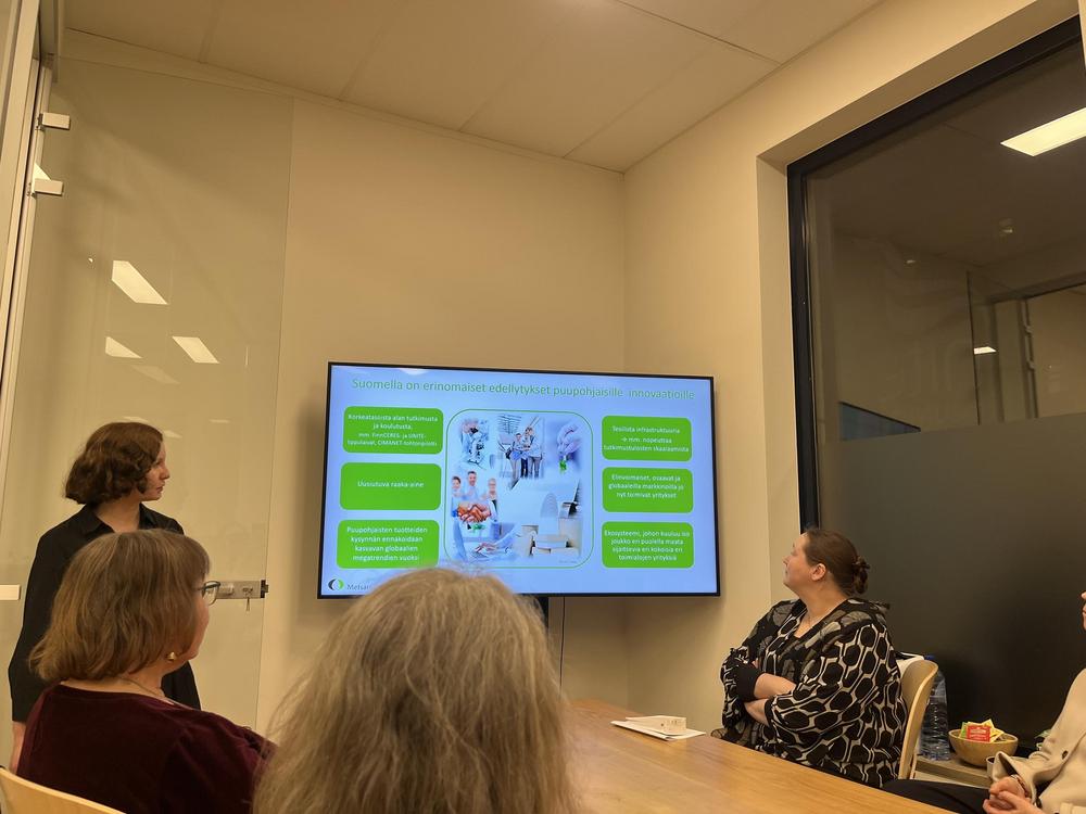 Seuraavaksi kuljimme muutaman korttelin päähän Metsäteollisuus ry:n tiloihin, jossa Marjaana Suorsa esitteli heidän toiminnastaan ja kertoi innovatiivisista biopohjaisista materiaaleista ja niiden käyttötarkoituksia akkumateriaaleista, lääketieteen sovellusten kautta aina satelliittien materiaaleihin asti. Saimme myös hiplata kaikkia Puun monet mahdollisuudet -näyttelyn tuotteita, kuten ihanaa Kuura-kuitua ja styroksin biopohjaisia korvaajia. Tilaisuus jatkui herkullisten napostelujen ja vilkkaan metsäkeskustelun myötä myöhään iltaan asti kun reilut 10 marttaa pääsi vauhtiin. Todella mielenkiintoinen ja inspiroiva ilta! Suurkiitos kolmelle asiantuntevalle ja vieraanvaraiselle emännällemme!