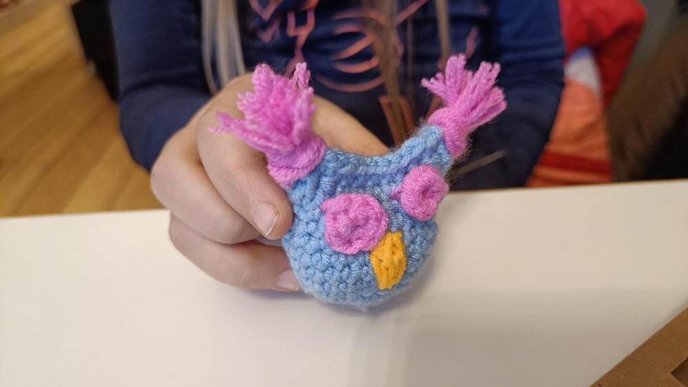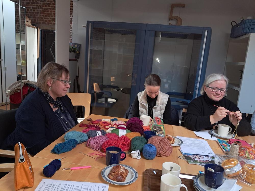 Kahdeksan hengen voimin nautimme käsitöiden tekemisestä, vertasimme eri kantapäiden malleja, ihailimme mohairin pehmeyttä, opettelimme taikasilmukoita ja työstimme amigurumeja ja korvakoruja. Kaikki tämä tapahtui iloisen puheenpulputuksen vauhdittamana.